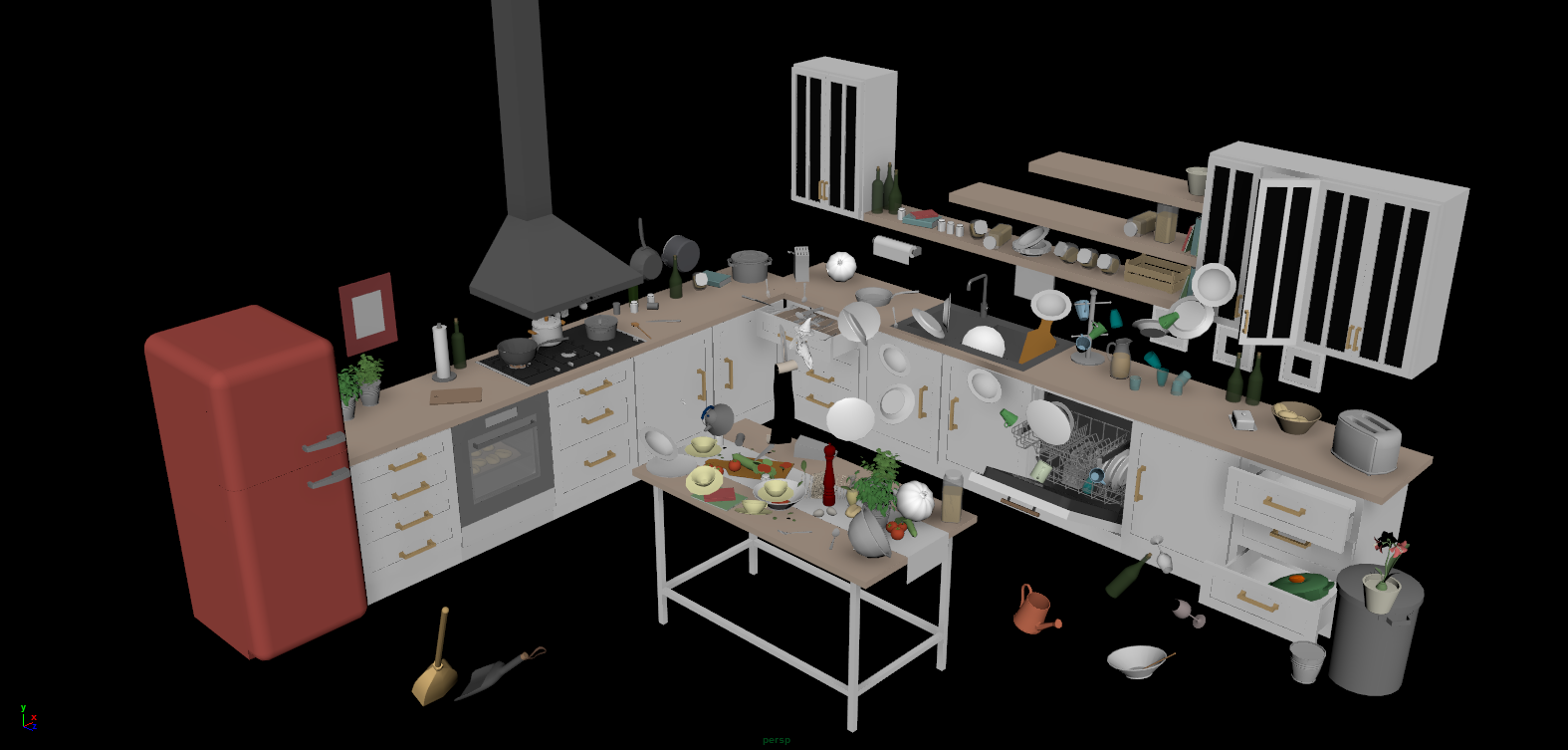 I was responsible for the kitchen design, modeling the kitchenette and the half of the overall props, texturing, shading, set layout/ -dressing, final layout, animatic, camera animation, lighting, rendering and credits animation.